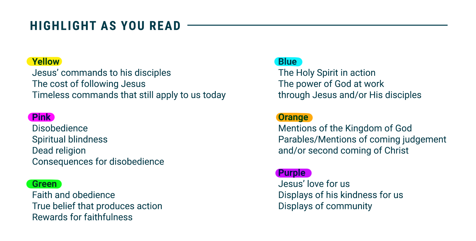 This method is especially helpful in recognizing themes or patterns in the scripture you’re reading. For example, by utilizing the different color categories, it’s easy to see Christ’s commands at a quick glance.