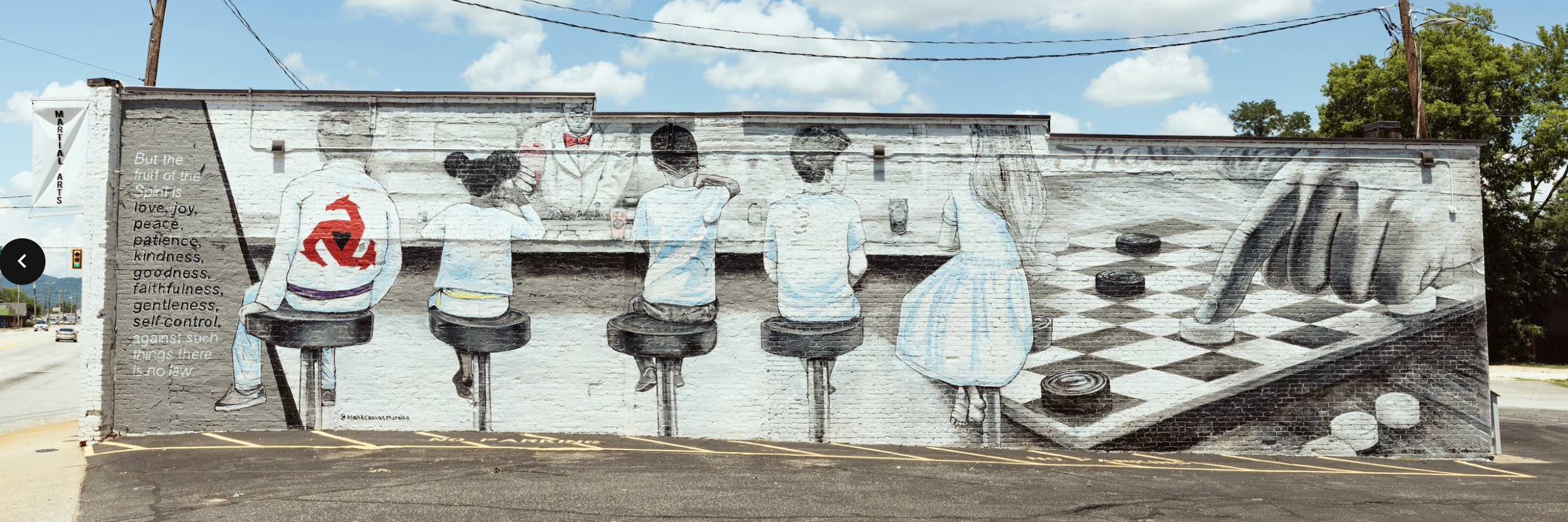 Adam just completed this one last June. This mural pays homage to Shaw’s Pharmacy, which was the original occupant of the building. J. Elvin Shaw was a well-known Greenville pharmacist and a checkers champion! These days, the building is home to Greenville Combatives Academy, so you’ll see one of the kids sitting at the pharmacy counter in his karate gear. Griggs Church especially appreciates the fruits of the Spirit being listed prominently for all driving down Poinsett to see.